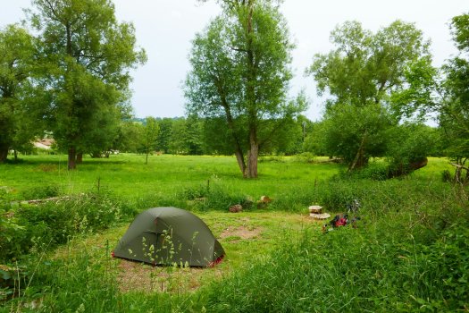 Ook het lijf heeft even tijd nodig om aan de inspanningen te wennen. Als ik mij s avonds uitrek in mn slaapzak schiet de kramp in mn kuiten. Maar vandaag, dag 4 fiets ik soepeltjes dik 130 kilometer! Okè, het landschap is over gegaan in prachtige glooiende heuvels die ik nog nèt niet met twee vingers in de neus doe, maar toch, het zijn heuvels …