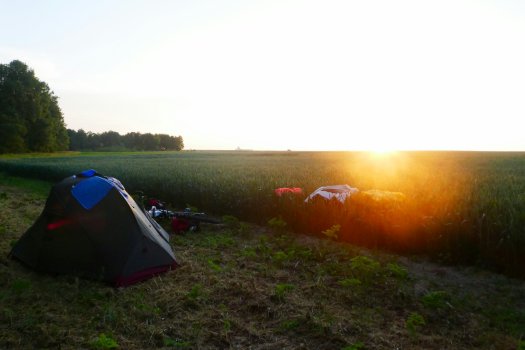 Even terug naar die lange dag van 130 km. Ik kwam pas rond 9 uur s’ avonds aan bij het enige overnachtings adres in de wijde omgeving. Een soort bed & breakfast. Bijna tegelijkertijd met een Belg die op de fiets onderweg was naar Rome. Maar dat terzijde. Een kamer bleek dik 50 euro. Best veel als je 6 weken onderweg bent. Ik kon wel n tentje op zetten in t speeltuintje. Dik betaald dan en zonder douche … Tsja, dacht ik dan kan ik dat tentje net zo goed een stukje buiten het dorp neerzetten. En zo vond ik een prachtig plekje tussen een stukje bos en een korenveld. Onzichtbaar vanaf de weg, perfect! Dácht ik …
