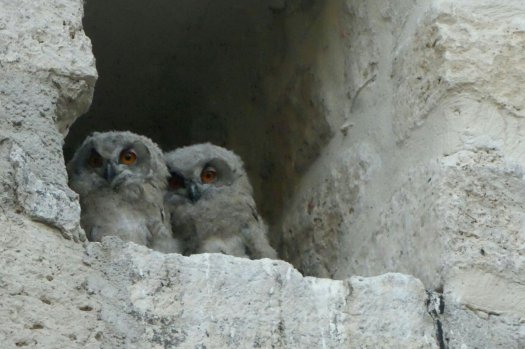 De dag eindigt ongelofelijk bijzonder. Als de schemer zijn intrede doet … worden de jonge uilen actiever. Eerst zitten ze ineens op een andere plek. Op een gegeven moment kunnen we vol verwondering en bewondering observeren hoe ze zich tussen de muren van de ruïne, hun habitat, verplaatsen. Het is prachtig om deze jonge maar al grote vogels vliegend te zien. Op een gegeven moment ontstaat er consternatie en lijkt het of ze naar elkaar roepen. Even later blijkt dat moeder uil (of vader) uil de komst aan heeft gekondigd. Een groter en donkerder exemplaar komt aangevlogen in de schemer en landt bij de jongen, het lijkt erop dat deze prooi aflevert bij de jonge uilen En weg is ze weer. Met open mond sta ik daar, wát een ervaring!