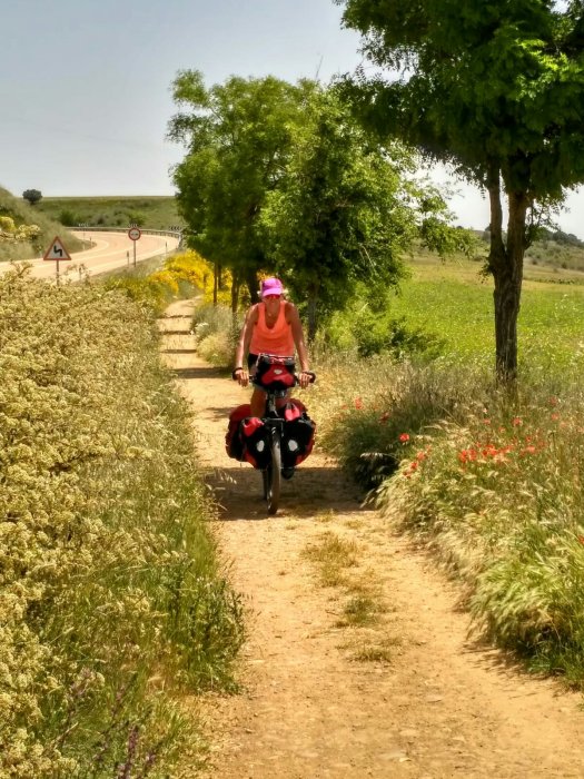 Deze twee dagen fietsen Elga en ik voor de verandering samen op. Waren in België de vele steile klimmetjes de uitdaging, in Frankrijk de regen en natuurlijk de Somportpas pas. Hier in Spanje is het de hitte! Zo rond het middaguur stijgt de temperatuur tot boven de 40 graden! We fietsen deze dagen vrij vlak en het landschap biedt niet zo heel veel afleiding. Wel hebben we het druk met groeten van de wandelaars ‘buen Camino!’ We proberen ons ook voor te stellen hoe de hitte is als je de Camino loopt! Op de fiets maak je nog wat rijwind! Ondanks al die uitdagingen wordt de kriebel om de Camino ook een keer te lopen bij mij groter en groter.