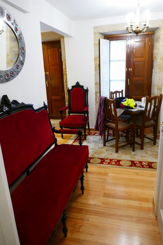 Nu nog een slaapplek … Zoals gewoonlijk wordt er voor mij gezorgd op de Camino. Van twee Belgische dames die ik tegen kom in de rij begrijp ik dat ik er wijs aan gedaan had een plekje in een albergue te reserveren. Alles zit vol, er zijn dit weekend festiviteiten. Maar opeens bedenkt èèn van hen dat ze door twee vriendelijke dames is aangesproken die een appartement aanboden voor 25 euro, vlak bij de Cathedral. Ik krijg het kaartje in mn handen gedrukt en het advies meteen maar even te bellen. Ja hoor de kamer is nog vrij. Met Compostolaat in the pocket ga ik op zoek naar het adres. En inderdaad vlakbij de Cathedraal wordt ik warm welkom geheten door een lieve grijze dame. De deuren gaan meteen wijd open als ze mijn fiets ziet. Hup, nat en wel in het halletje. De dame laat mij binnen in een prachtig sfeervol appartement. Wow werkelijk een paleisje na alle slaapzalen en zaaltjes met stapelbedden!!! Ik bedank haar hartelijk.
