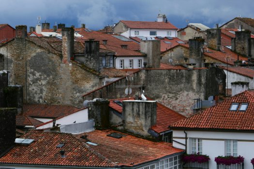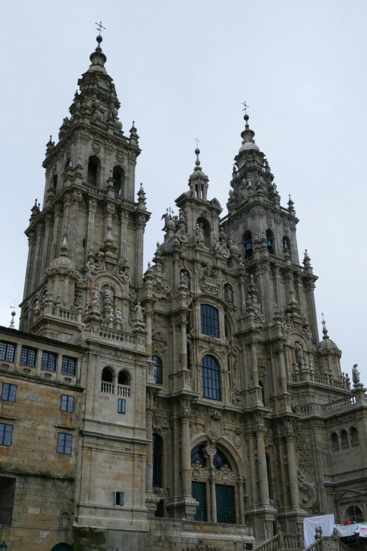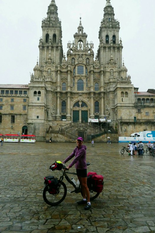 Uiteindelijk was daar, na toch nog aardig wat gemene klimmetjes, dan toch de aankomst in Santiago! Slechte timing, na zòveel zonnige dagen rol ik de stad in met regen en onweer! Ook hier raak ik weer even van het padje … wáár is nu die beroemde Cathedral en het plein waar alle pelgrims aankomen??? Eindelijk bij de Cathedral aangekomen mis ik het plaatje van aankomende en net aangekomen pelgrims. Ik sta daar wat verloren en vertwijfeld rond te kijken. Een ‘rondje om de kerk’, nog best ingewikkeld met al die trappen, leert mij dat dit bewuste plein zich aan de andere kant bevind. En daar sta ik dan uiteindelijk samen met andere net aangekomen pelgrims. Wat verdwaast, schuilend voor de regen die nu echt hard gaat.