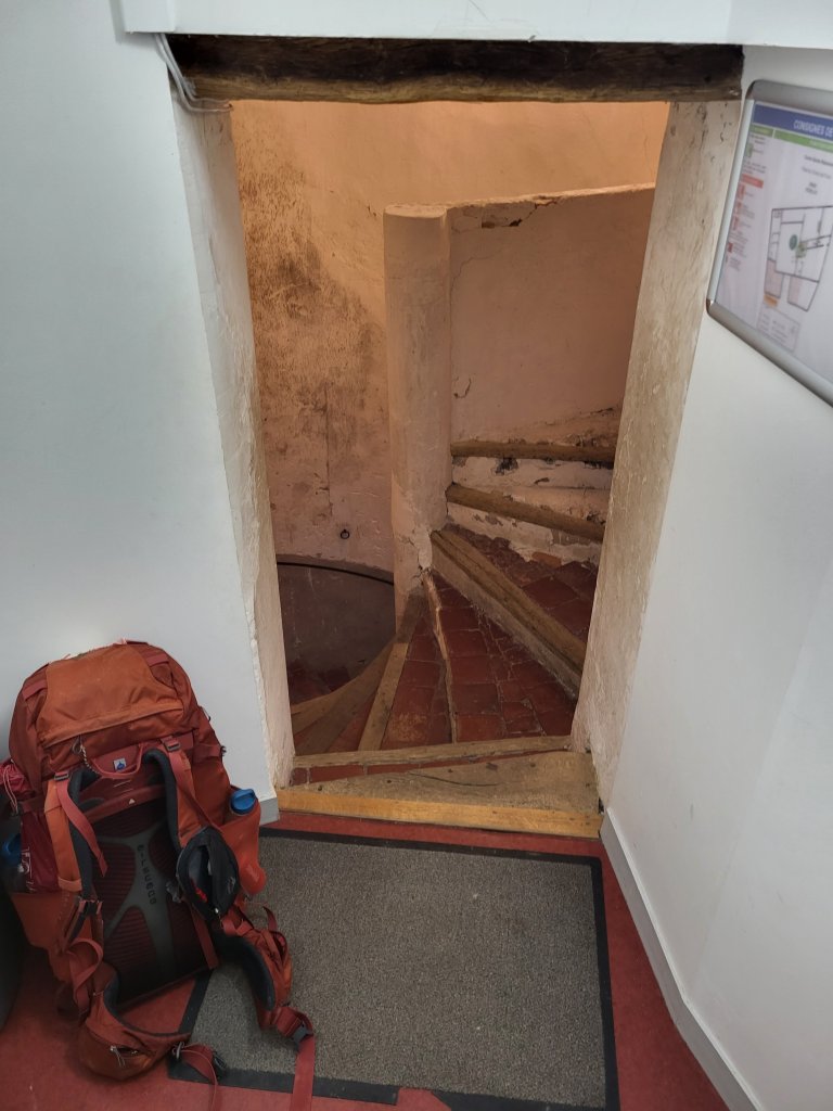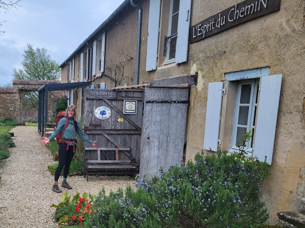 Het laatste stukje loop ik met Theo op, een  laatste steil klimmetje en we lopen het gehucht Le Chemin in. De ontvangst bij L’Esprit du Chemin is warm, de herberg is pràchtig en voelt als een warme deken van geborgenheid. De plek straalt aandacht, warmte en toewijding uit. En wéér belanden wij knus bij de houtkachel met een heerlijk biertje. Met een kring die steeds groter wordt. Tot de dagelijkse routine van douchen en handwasje zich aandiend. Er komt wat jeugdsentiment omhoog als we, heel praktisch de centrifuge ontwaren en geven elkaar een lesje in het goed laden van de centrifuge.