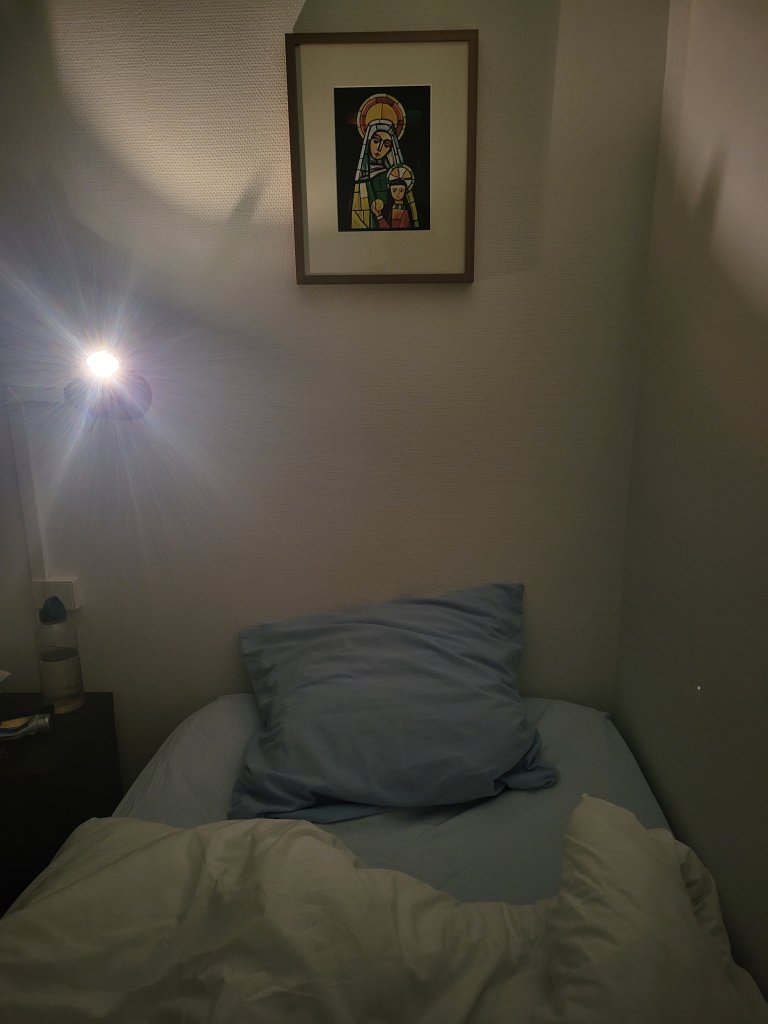 Ik ben op tijd buiten de muren om het separate slaapgedeelte op te zoeken en geniet van een comfortabele rustige nacht onder het toeziend ook van moeder Maria.