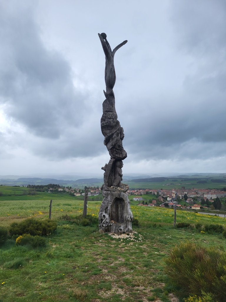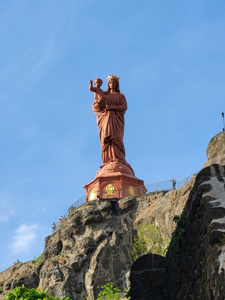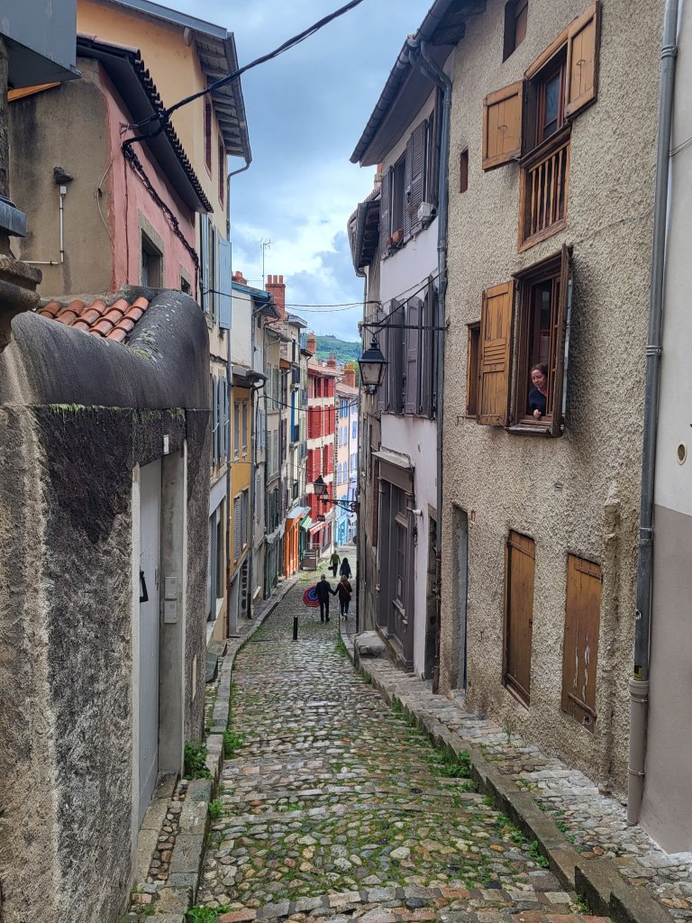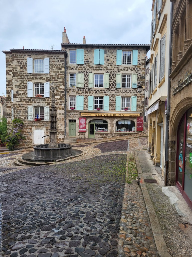 En zó sta ik na de mis al om 8 uur op straat. Een lange dag om een koud en regenachtig Le Puy te ervaren. Ik struin door de stad, klim naar de Chapelle de Saint Michel d’Aiguilhe op een 85 meter hoge vulkanische schoorsteen. De Madonna die hoog over de stad uitkijkt bewonder ik vanaf straat nivo. Ik vindt een goed restaurant voor de lunch op zijn Frans en zit te vernikkelen op het terras. Voor het dessert verhuis ik naar binnen, waar het evengoed fris is.