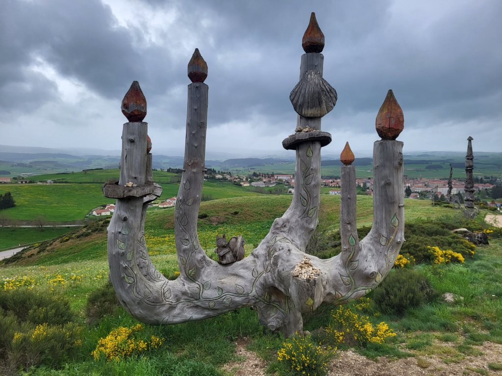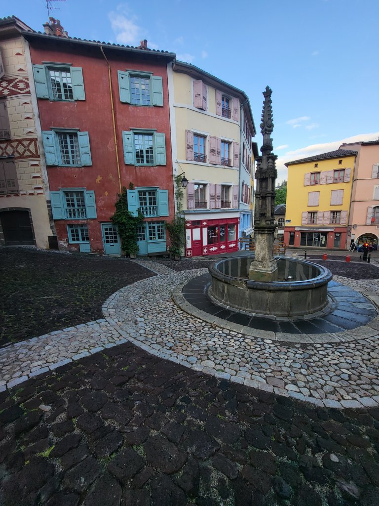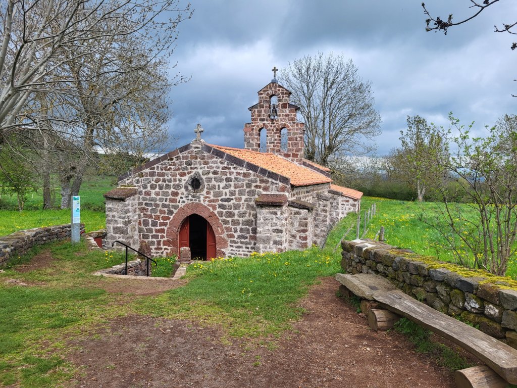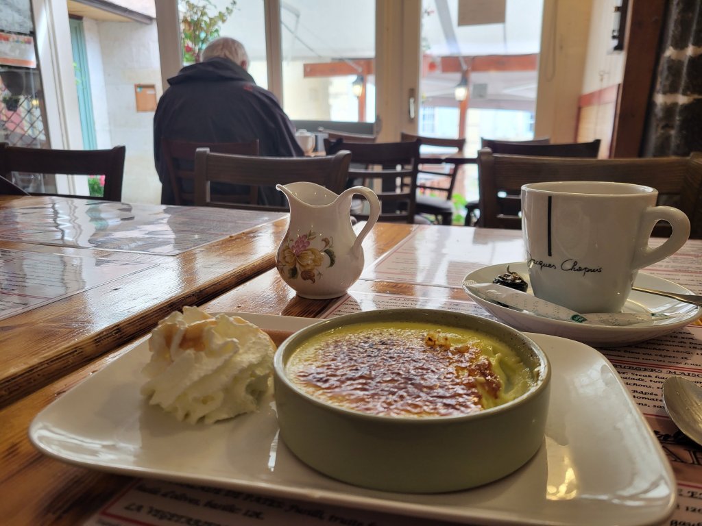 En zó sta ik na de mis al om 8 uur op straat. Een lange dag om een koud en regenachtig Le Puy te ervaren. Ik struin door de stad, klim naar de Chapelle de Saint Michel d’Aiguilhe op een 85 meter hoge vulkanische schoorsteen. De Madonna die hoog over de stad uitkijkt bewonder ik vanaf straat nivo. Ik vindt een goed restaurant voor de lunch op zijn Frans en zit te vernikkelen op het terras. Voor het dessert verhuis ik naar binnen, waar het evengoed fris is.