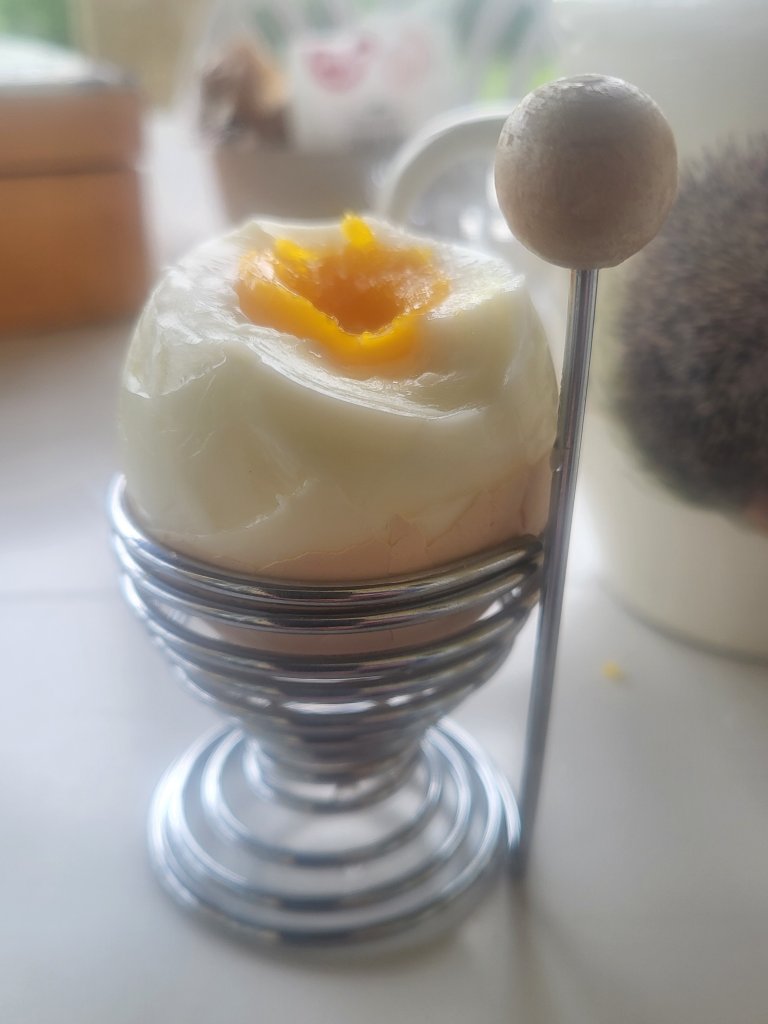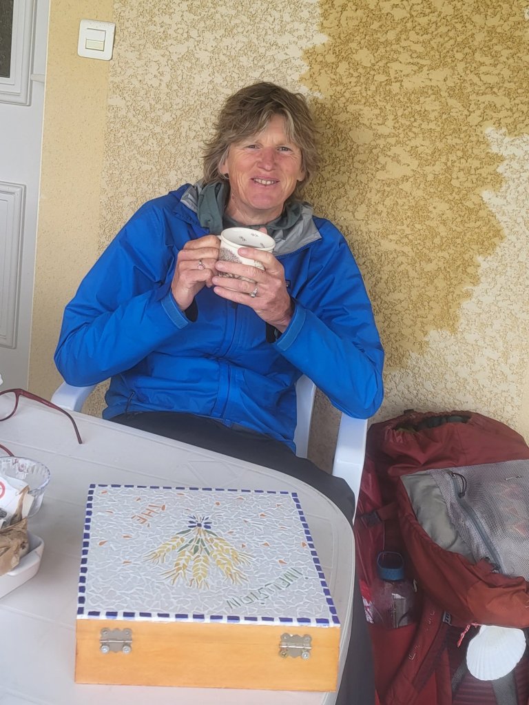 De middag valt er weer veel regen en is het koud. Ik passeer een terras bij een woonhuis waar thee en koffie wordt geserveerd, droog onder de luifel. Ik schuif dankbaar aan voor een kop thee. Een collega pelgrim beveelt mij een gekookt eitje aan, het lekkerste ei dat zij òòit gegeten heeft. Ik bestel er één … alles wat warm is is meegenomen vanmiddag. Hij is inderdaad hèèrlijk en perfèct gekookt!