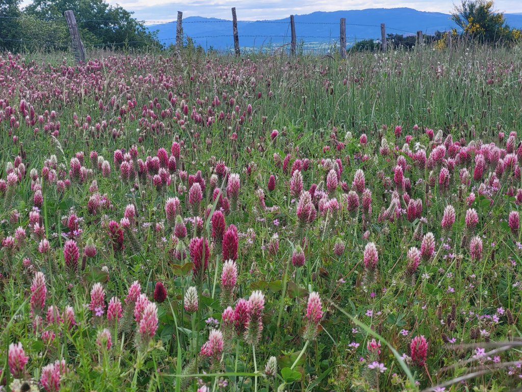 De route volgt een stuk de Lot, nadat de  route afbuigt geniet ik van de glooiende velden vol bloeiende Klaver, één paarse bloemenzee!