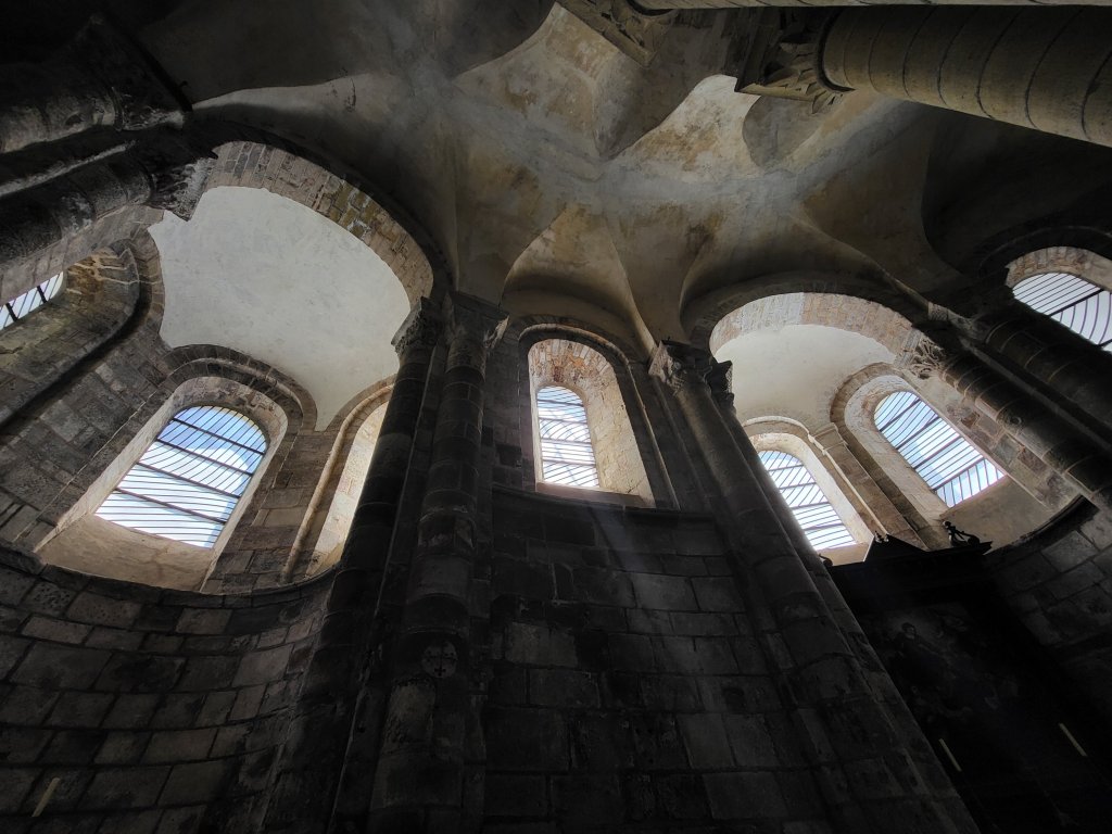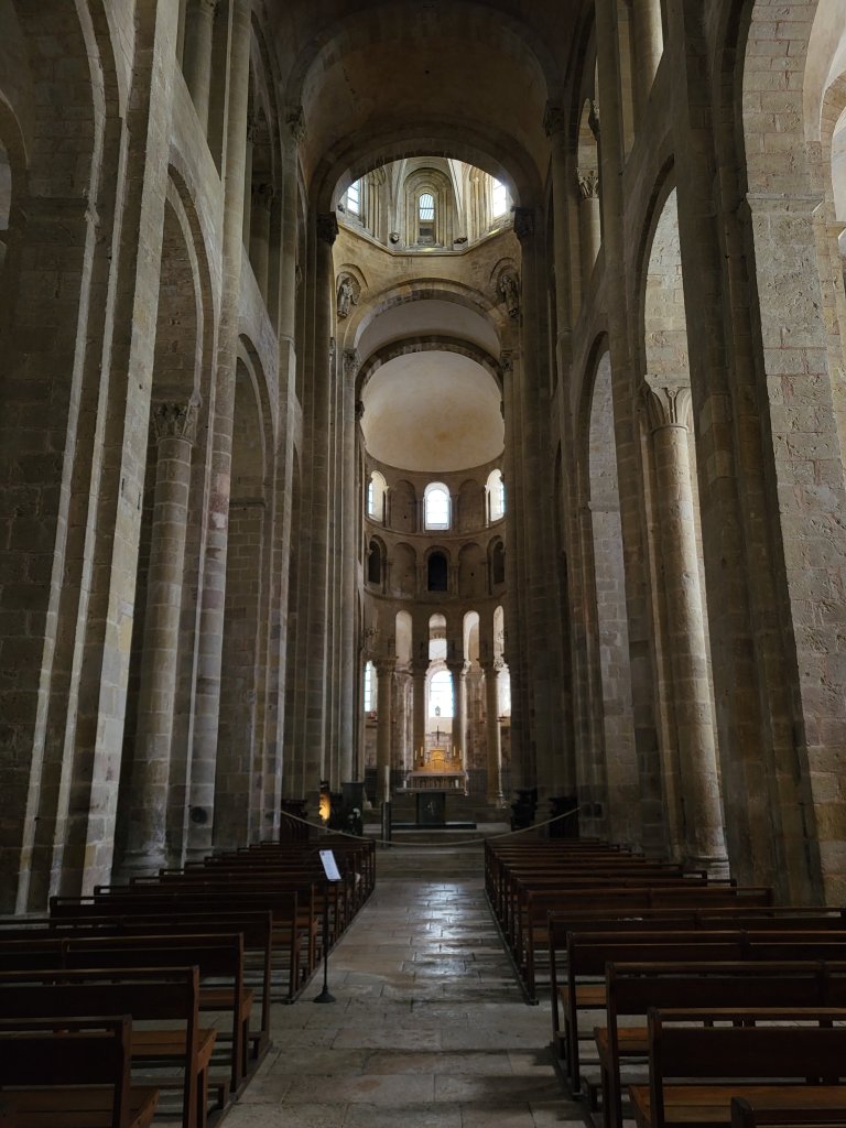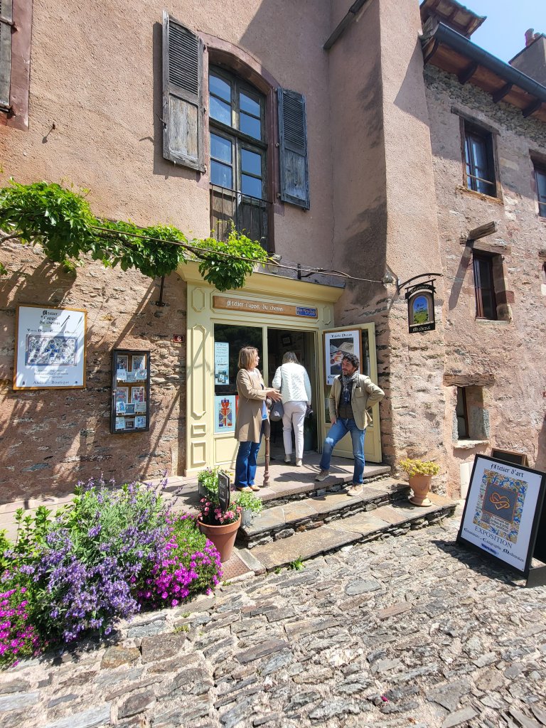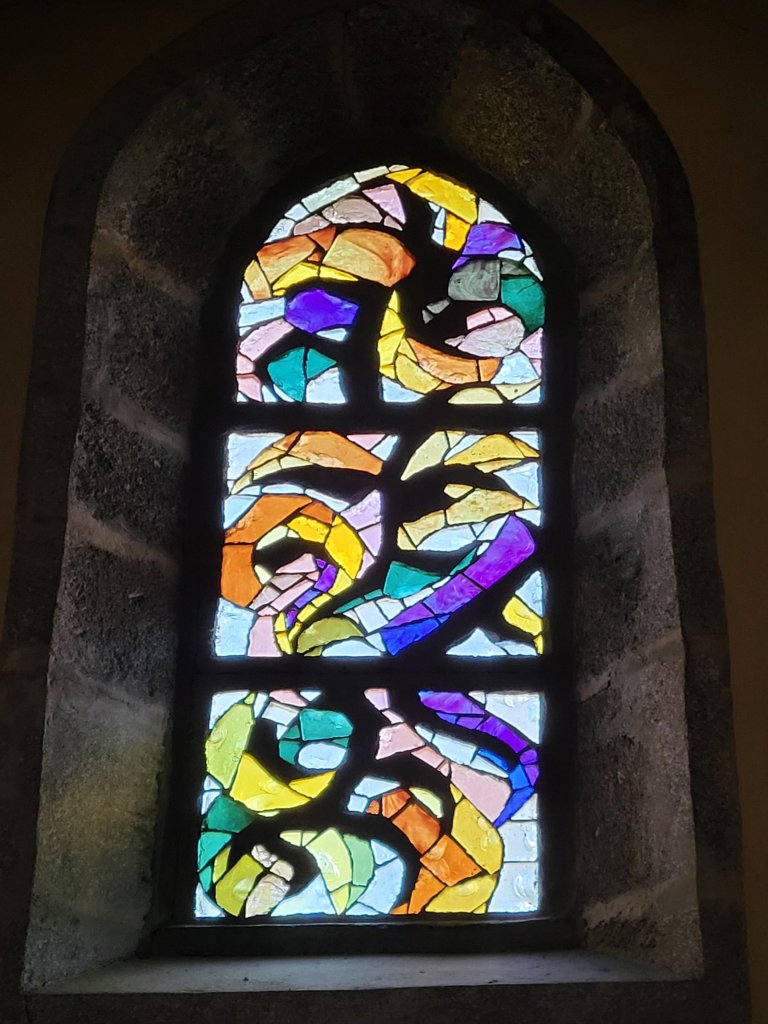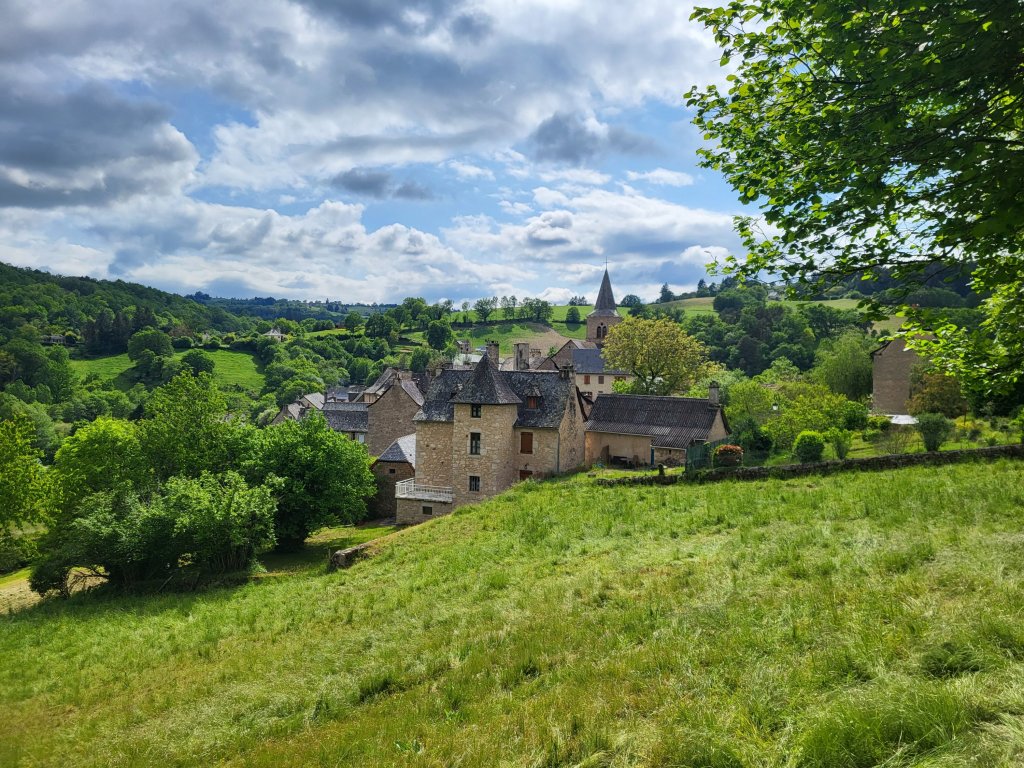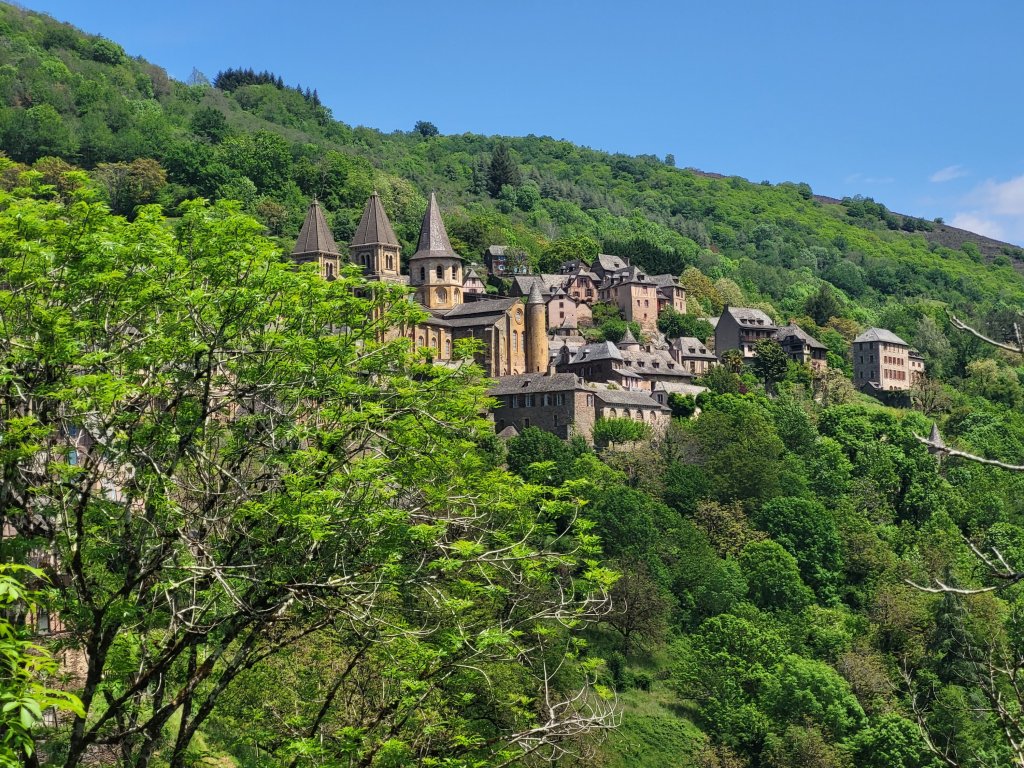 Het is vanaf Sénerques een uurtje of 2 lopen naar Conques. Een prachtig dorp en, komende vanuit Le Puy en Velay, van oudsher een belangrijke etappeplaats op de pelgrimsroute naar Santiago de Compostella. Naast dat het een heel charmant dorp is om doorheen te slenteren is de Abdijkerk met de door de kunstenaar Pierre Soulages ontworpen glas in loodramen een bezoek waard. Dit is wat internet erover vermeld; “De sobere, hedendaagse glas in loodramen ontworpen door de schilder Pierre Soulages sublimeren de architectuur van de abdijkerk en onderstrepen haar spirituele kracht.” Ik kan het niet mooier verwoorden, wel beamen!
