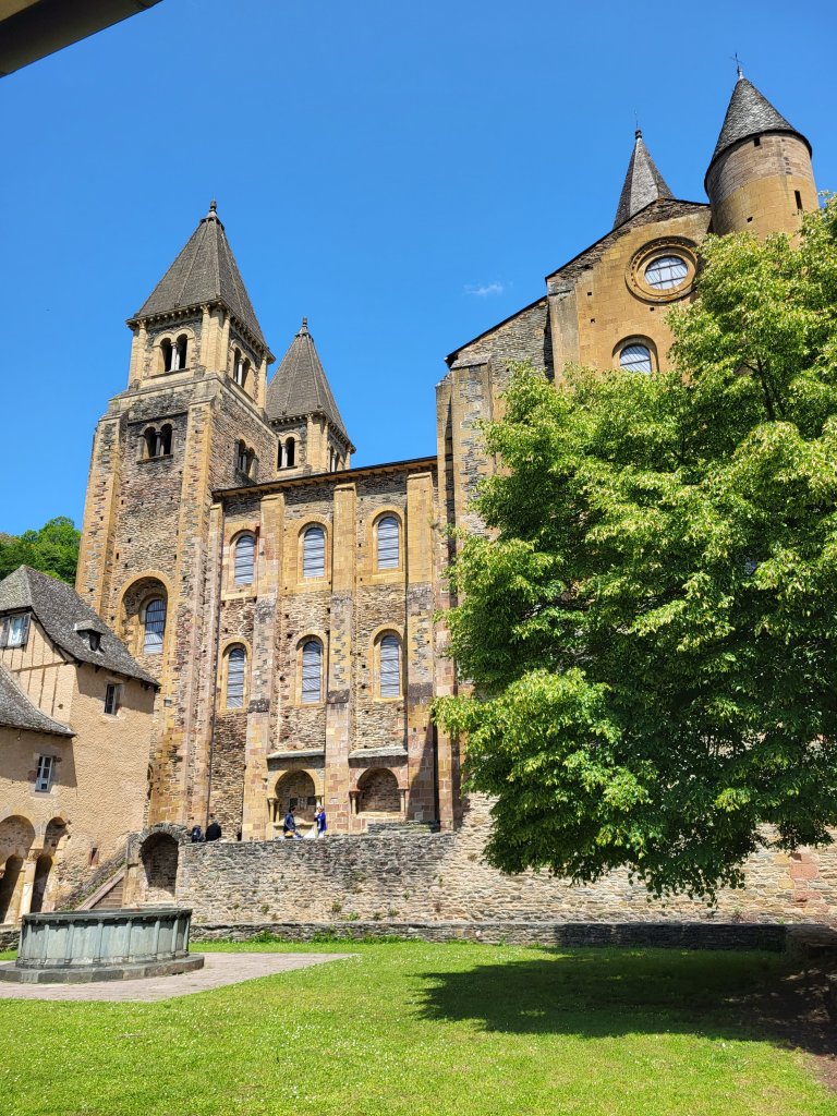 Ik neem de tijd om hier wat rond te kijken. Maar éérst strijk ik neer op een piepklein terrasje, in de ochtendzon tegen de gevel van een eeuwenoud pand in één van de steile straatjes. Uitkijkend op de beroemde Abdijkerk van Sante Foy drink ik koffie met een heerlijke plak cake uit eigen keuken. En nòg een kop koffie met nog een plak cake … want ze hebben twee smaken. Ik zit en geniet en zie hoe het plaatsje langzaam tot leven komt.