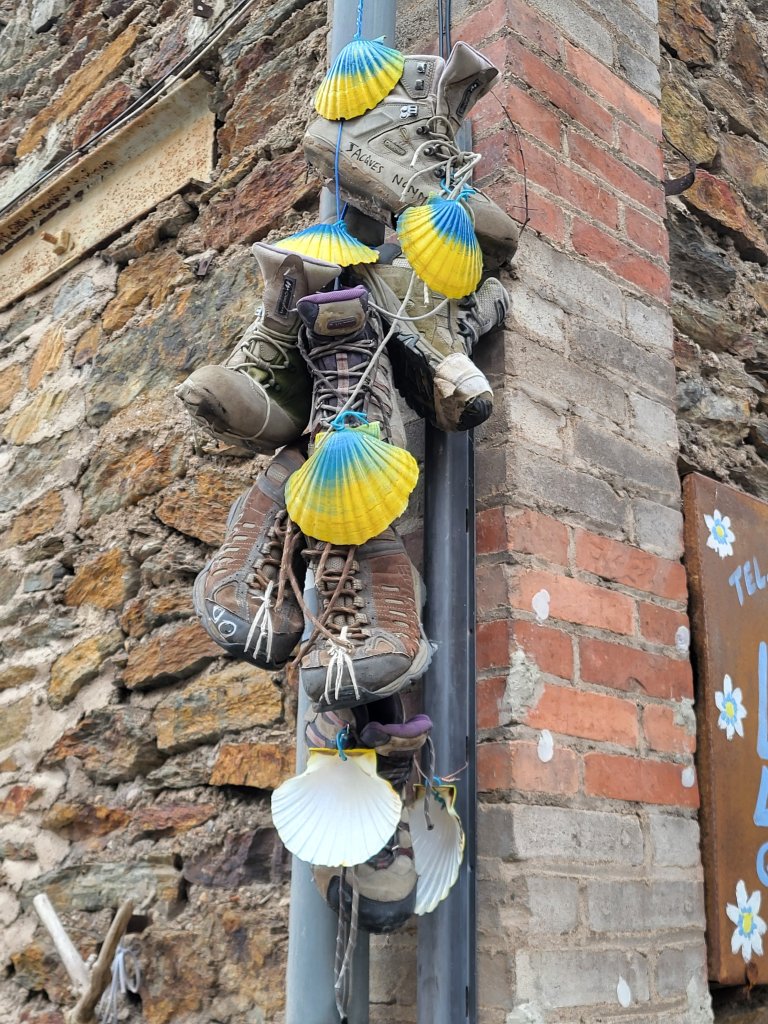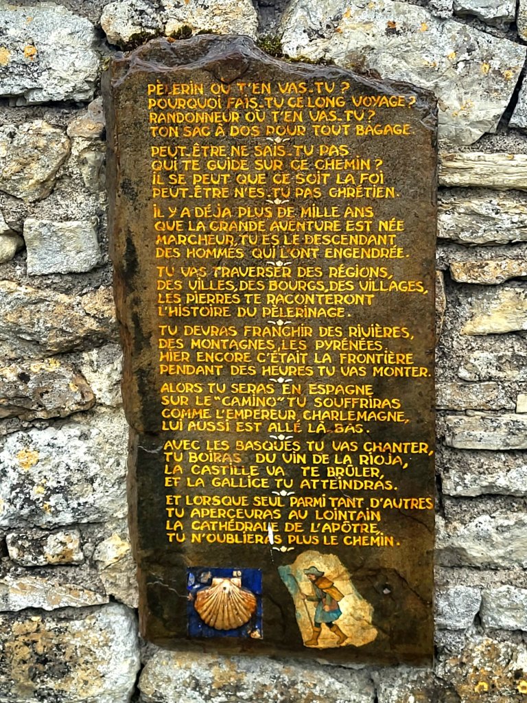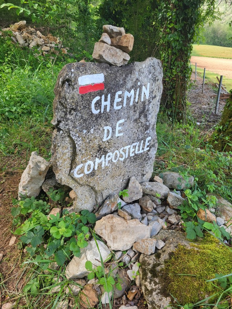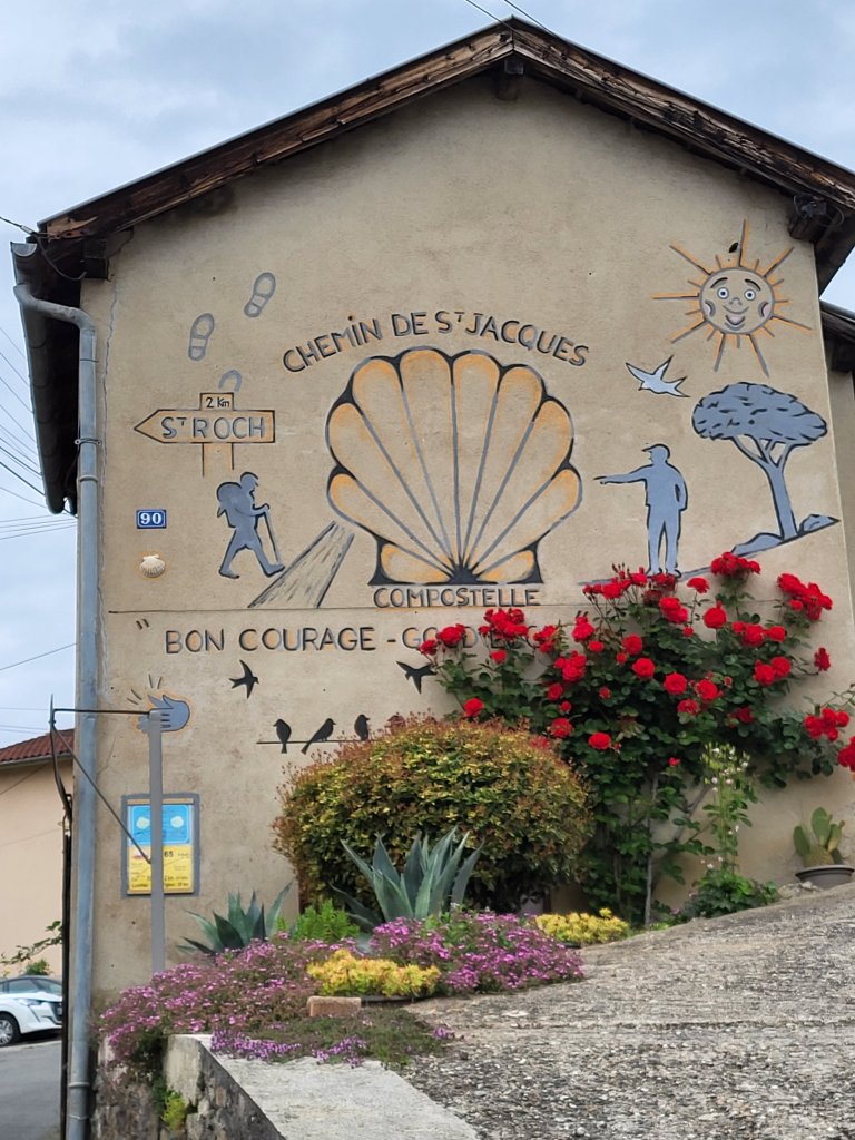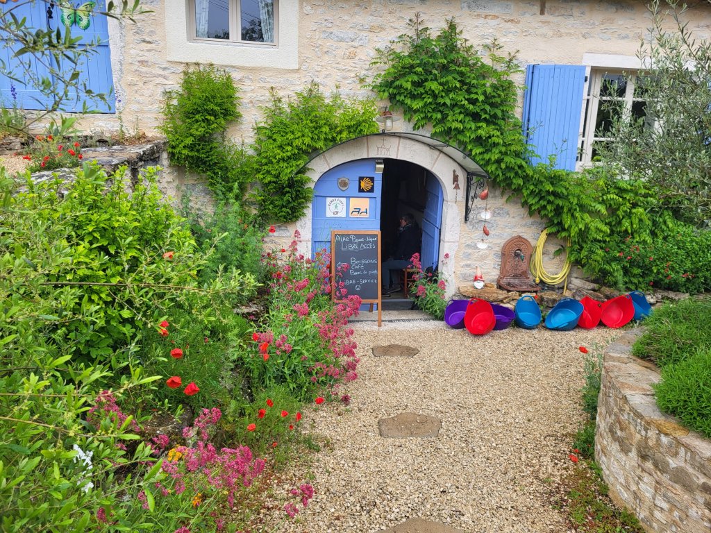 Het is warme en zonnige dag. Ik passeer de Gite st Jaques en strijk er even neer om meteen mijn schoenen eens goed in te vetten. Een goed moment, ze zijn nu schoon en droog. En ze hebben het verdiend! Het is blijkt een gite waar zowel  Pelgrims als mensen die herstellende zijn van een burn out terecht kunnen. Degenen die hier komen om te herstellen vertoeven er een maand, nemen een eenvoudige  taak naar keuze op zich, en kunnen in de loop van de tijd in contact zijn met de pelgrims die, volgens de oprichter, altijd prettige en ontspannen gezelsschap zijn en tijdens hun tocht niet bezig met stressvolle thema’s. Na de gezamelijke maaltijd wordt dafelijks traditioneel een Tour du table gehouden waarbij ieder iets kan delen over zijn tocht of wat hem of haar bezighoudt. Een mooi concept!