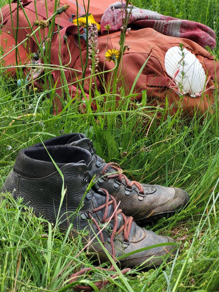 Ik heb schoenen en sokken uitgedaan en bewonder mijn voeten die mij en mijn gevulde rugzak inmiddels over ruim duizend kilometer aan paden en wegen hier brachten. En ben dankbaar voor mijn schoenen die, in al hun eenvoud en vernuft mijn voeten in staat stelden die monster klus te klaren!