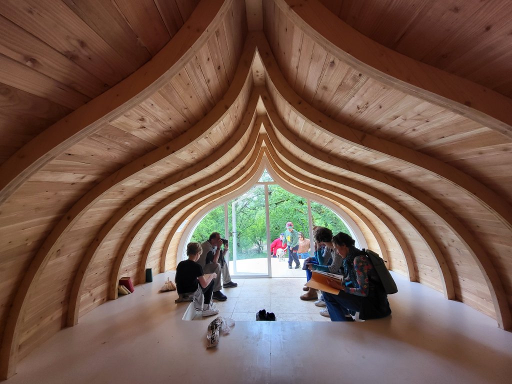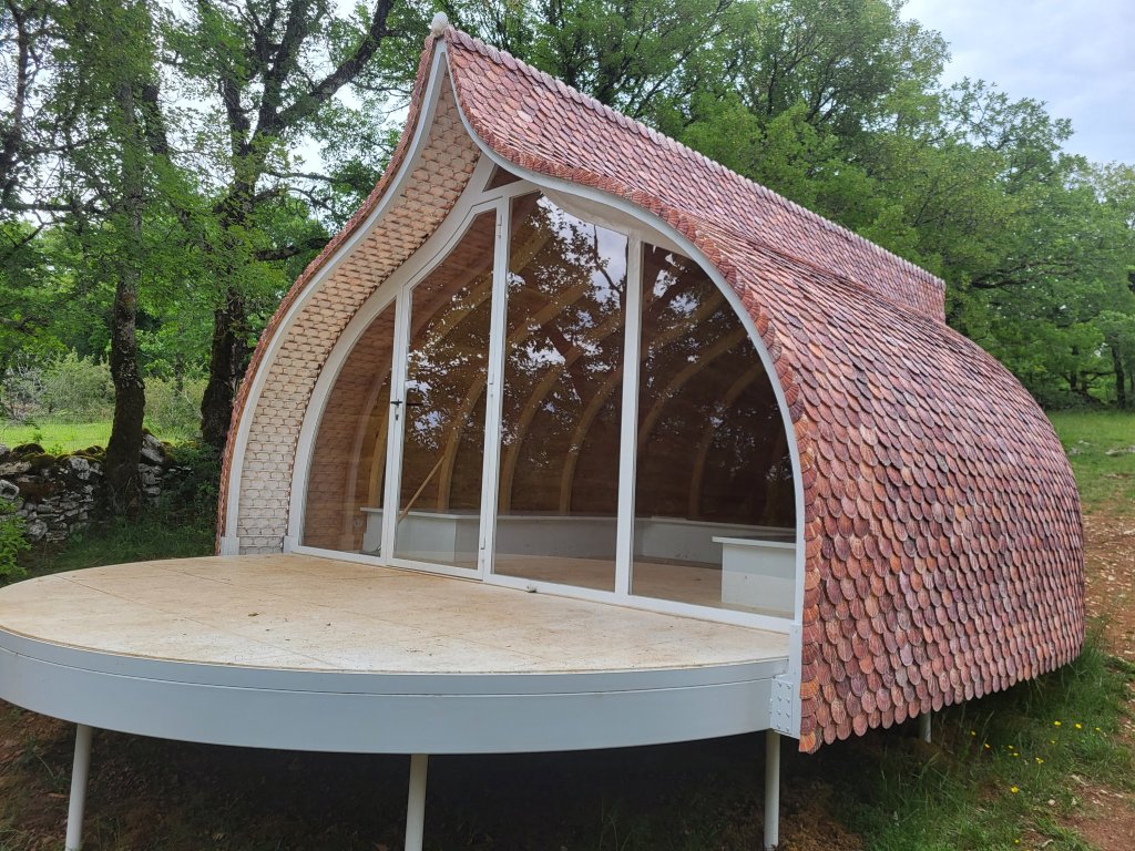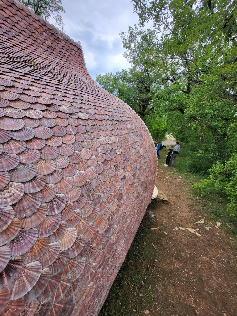 Onderweg passeer ik opnieuw een object uit de reeks creatieve onderkomens. Ook nu slaap ik er niet maar ik neem er wel een uitgebreide middagpauze. Nadat ik er een tijdje alleen binnen heb gezeten in dit bijzondere bouwsel lopen er wat toeristen rondom en voel ik mij een beetje een attractie hier in deze shelter waarvan het dak is bedekt met Jacobsschelpen. Schuchter, alsof ze bang zijn huisvredebreuk te plegen druppelen ze toch binnen, we raken even aan de praat, dan vervolg ik mijn tocht.