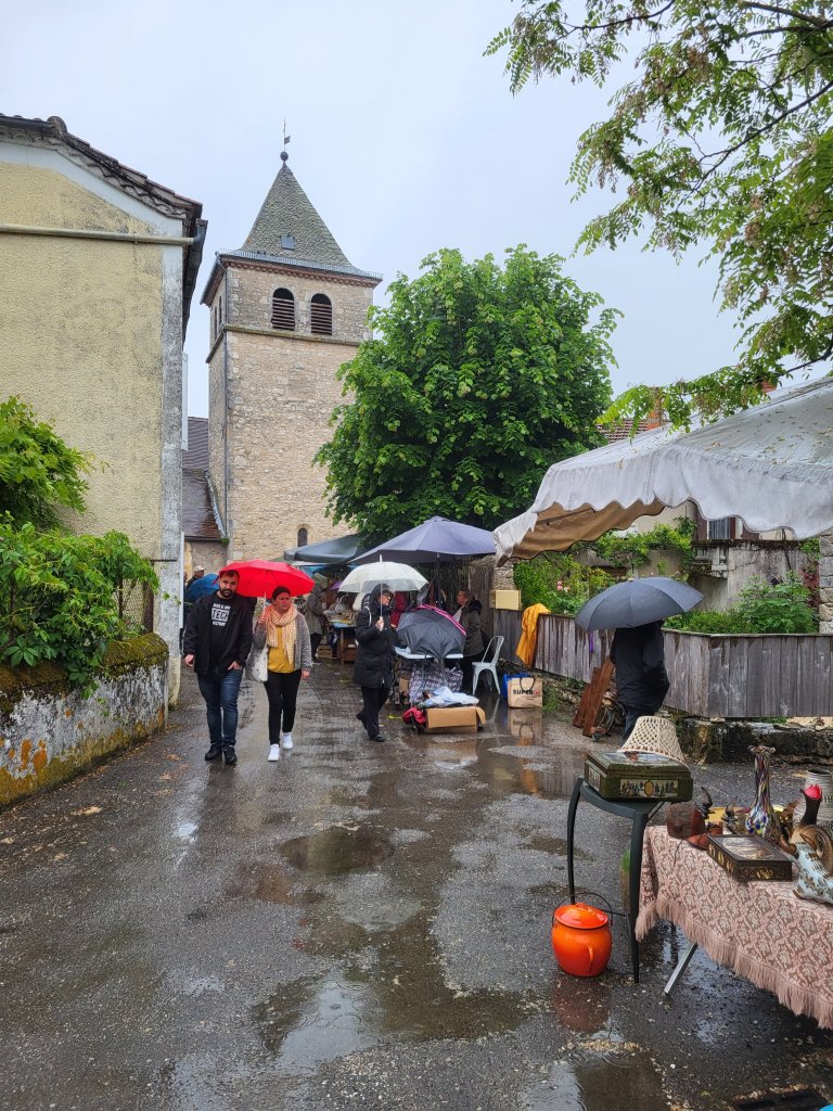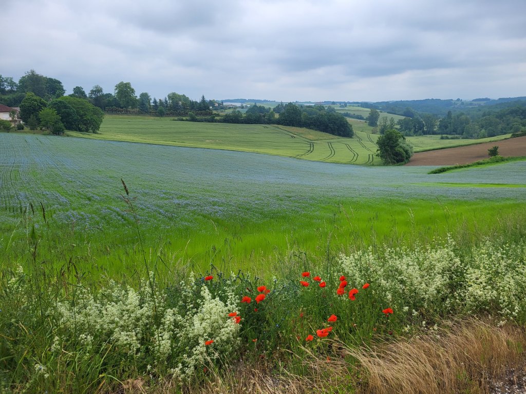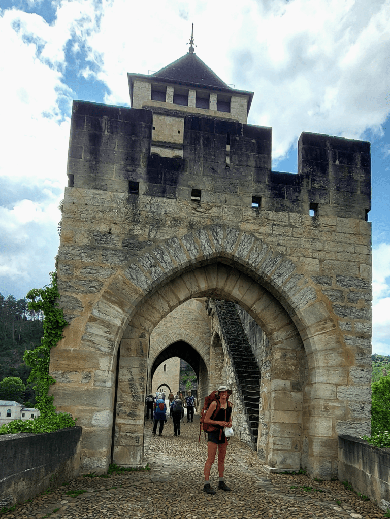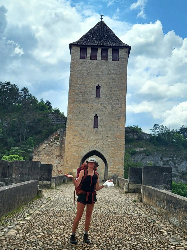 Als ik Cahors uiteindelijk verlaat via de brug aan de andere zijde van de stad, krijg ik een flasback. Ook in 2018 ging ik over deze brug, in de regen op de fiets, op weg naar Santiago. Aan de overzijde ontmoette ik toen Elga, die ook op de fiets onderweg was naar Santiago. Nu stap ik de brug over in het zonnetje maar donkere wolken pakken zich al samen … er is onweer op komst. Ik klim langs een stijl pad omhoog en kom die middag in een fikse onweersbui terecht!