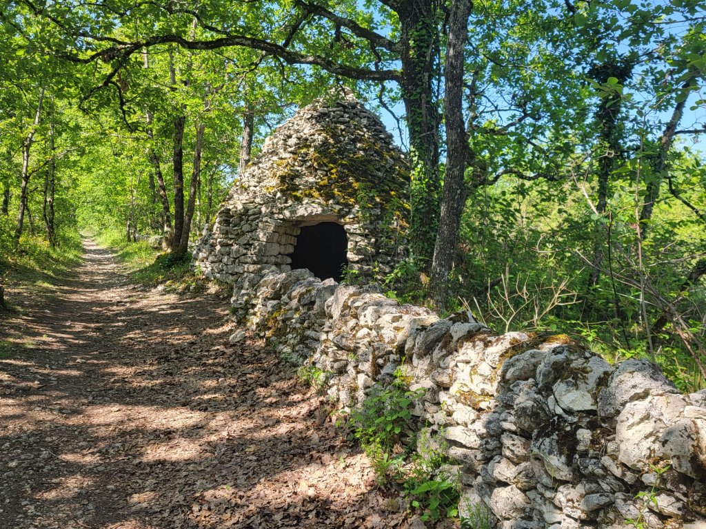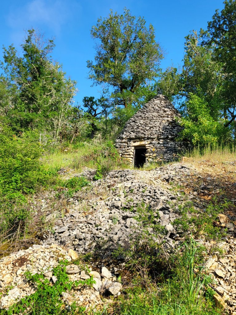 Een kilometer of 8 vòòr Cahors spot ik een voor deze streek zo karakteristiek stenen huisje. Het ligt tegen de helling aan, een stukje van het pad. Ik neem polshoogte en besluit hier mijn matje en slaapzak uit te spreiden en er te overnachten. Ik lig droog en het is een prachtige stille plek. De avond is aangenaam zonnig en warm. Als ik mij heb geïnstalleerd komt er nog een enkele wandelaar, hardloper en mountainbiker langswandelaars. We begroeten elkaar vriendelijk … goed volk. Zo zit ik nog een paar uurtjes voor ‘mijn’ huisje in het avondzonnetje vòòr ik mijn slaapzak inkruip voor een prachtige nacht. Ik slaap als een roos en wordt alleen even wakker van een spokend hert. Als ik in de nacht het huisje uitstap om te toiletteren is het doodstil en geniet ik weer eens van een mega heldere sterrenhemel!