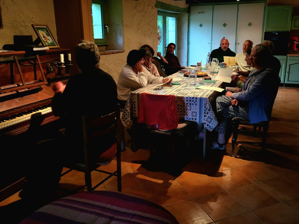 Als ik bij het bewuste huis aan kom overhandig im de knoflook; “Voilá, un cadeau du voisin!” Buurman kan het wel waarderen en ik moet meteen maar even meeproeven … oef, dìe is pittig! Behalve mijn gastheer lijkt er niemand anders aanwezig. Hij gaat mij voor in het huis, toont de logeerkamer en nog een zolderkamer. Ik kan de tent opzetten maar ik kan ook in de logeerkamer, of op zolder. Wat um prettig vindt. En hier is het toilet en hier de badkamer. Hij kan straks een ommelet maken met wat brood en kaas en wijn dan kunnen we met elkaar een hapje eten. Ik breng mijn salade en biertje meteen maar in voor de potluck. Vervolgens zit ik op het terras met een glas bier bij een wildvreemde man die zijn pijp stopt en waar ik nog niet echt goed hoogte van krijg. Maar goed, buurman zei dat het wel goed zat. Ik doe een paar pogingen, maar het gesprek komt niet echt op gang, Op een gegeven moment merkt hij op dat hij nog aan het werk moet in de tuin.