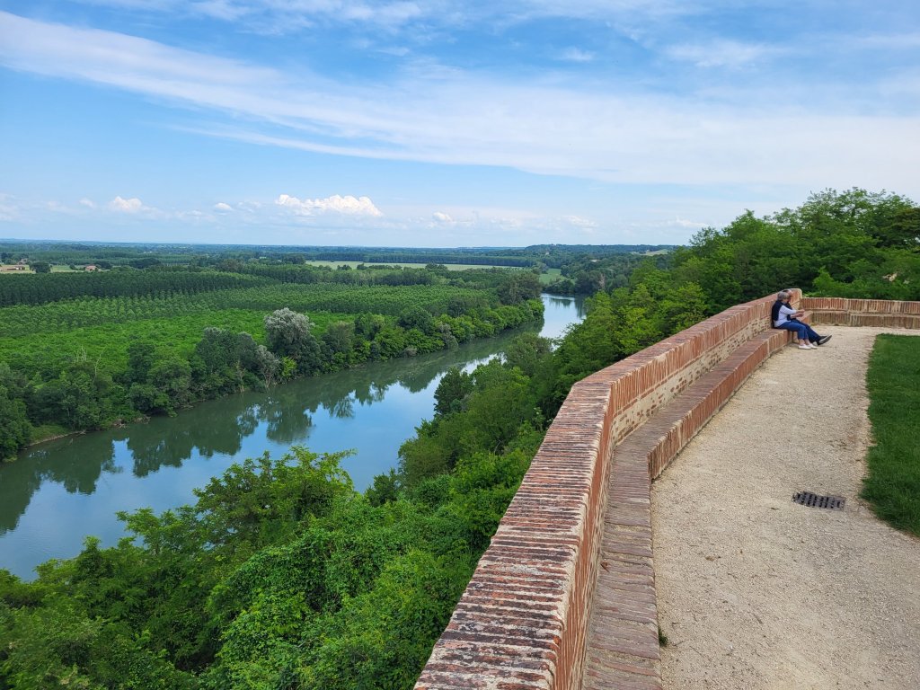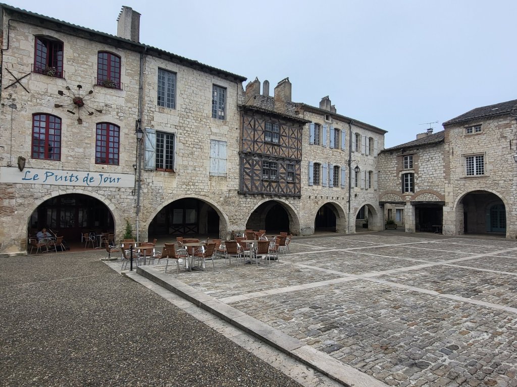 Ik neem de tijd voor een potje thee, ontbijtje en koffie en kan intussen mijn telefoon opladen. Wanneer ik weer op wil stappen blijkt hij nog steeds even leeg. Noodgedwongen hang ik zo nog een tijdje rond in Cahors. Op een ander terrasje raak ik in een leuk gesprek met een jonge Fransman die zijn trektocht noodgedwongen voortijdig af heeft moeyen breken. Ongetraind en tè enthousiast van start gegaan en zo een vervelende blessure opgelopen. Maar later dit jaar komt hij terug vertelt hij. Om dan beter voorbereid en voor een lange periode door te lopen naar Santiago. We komen tot de conclusie dat deze ervaring, hoe zuur ook, hem waarschijnlijk heeft behoed voor een blessure tijdens de lange tocht die hij in het verschiet heeft. De kans dat hij over een maand of wat stukken beter voorbereid op pad gaat dan nu is groot.