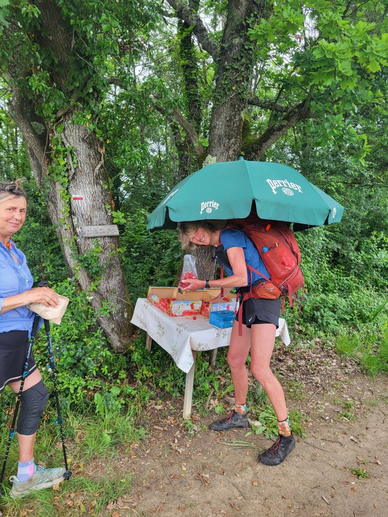 Een passerende auto stopt en de bestuurder vraagt waar ik heen ga. Het is immers vrij laat en de komende kilometers is er geen dorp, stadje of overnachtingsplek in het verschiet. Ik leg uit dat ik verderop een plekje voor mijn tent ga zoeken. “Die heb ik” geeft meneer aan. Àh, oké … hij legt uit waar ik het huis kan vinden en ik bedank hem. Het is nog een klein half uurtje lopen. Als ik doorloop ga ik even met mezelf in conclaaf, voelt dit oké? Hij heeft niets gezegd over zijn vrouw of familie en het huis ligt vrij afgezonderd. Ik besluit mezelf nog even bedenktijd te geven. Als ik een boerderij passeer, waarschijnlijk de dichtsbijzijnde buurman besluit ik daar om water te vragen. Als ik alsnog besluit door te lopen heb ik in ieder geval water èn misschien wordt ik bij buurman wat wijzer … een referentie zeg maar. Er ko.t een vrolijke buurman aanlopen als ik het erf op kom en hij vult binnen mijn waterflessen. Hij spreekt geen woord Engels maar het lukt mij in het Frans mijn vraag over te brengen. Buurman stelt mij gerust; “Non non, c’est bòn, pas de problème!” Er komt nog een heel verhaal achteraan waar ik niets van begrijp maar dat maakt niet uit. Ik ben gerust!