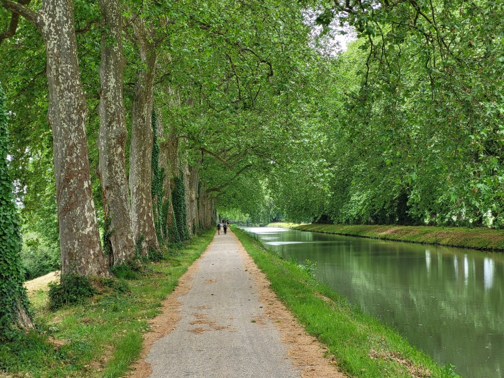 De route vanuit Moissac loopt voor een groot deel langs het Canal Latéral à la Garonne, aardig vlak dus. In de loop van de middag doe ik Auvillair aan. Een dorp dat bekend staat als een van de mooiste dorpen in Frankrijk. Ook deze plek ken ik van mijn fietstocht 5 jaar terug. Ik sliep hier in de plaatselijke gite een prachtige plek. Dit keer slaap ik ik er niet want ik wil nog een kilometer of wat doorlopen. Ik heb een rustig plekje voor de tent in gedachten, ergens langs een riviertje of aan de rand van een bos. Ik neem in Auvilair wel rustig de tijd voor een kop koffie op het prachtige dorpsplein en herontdek het dorp nog eens. Dan sla ik wat te eten en een lekker biertje in voor de avond en loop nog wat uurtjes door. Als ik rond een uur of 6 ‘de digitale kaart’ op checkt schat ik in dat ik met een klein uurtje bij een riviertje beland. Ik wil kijken of ik daar een mooi plekje voor de tent kan vinden.