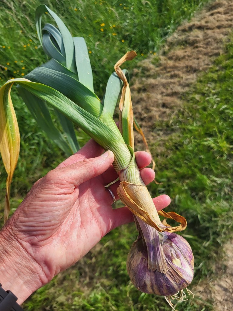 Als ik het erf weer afloop roept buurman mij terug. Hij verdwijnt naar binnen en komt weer naar buiten met een flinke knol verse knuloflook, het loof er nog aan. Hij duwt het mij lachend in de hand; “Ici, un cadeau pour le voisin!” En met een brede smile maakt hij duidelijk … in plaats van een bosje bloemen! En daar loop ik dan met een big smile met mijn rugzak op langs de weg, streng knoflook in de hand, op weg naar de buurman. Wat gebeurt mij nú weer allemaal!