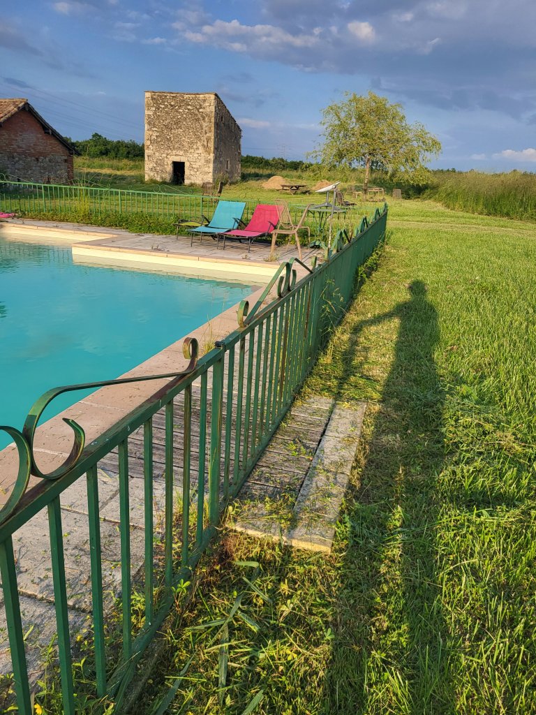 Na het klussen in de tuin bekijken we wat foto’s van de voettocht naar Lourdes die hij een paar weken terug met een groep maakte, dan gaat hij de keuken in voor een gebakken eitje en even later zitten we aan onze potluck maaltijd met een glas wijn. Hij lijkt wat meer los te komen na mijn maaiactie en het bekijken van de wandelfoto’s en ik krijg íets meer hoogte van mij gastheer. Drie volwassen kids en kleinkinderen, gepensioneerd. Zijn vrouw zit op het moment in Parijs (waar zij tot zijn pensioen woonden) en heeft hem hier volgens eigen zeggen wat onhand achtergelaten. Normaal geeft vrouwlief de opdrachten, nu moet hij het zelf allemaal bedenken… Na het eten staat hij wat onthand bij de vaatwasser. Nu moet ik hier ergens iets in doen als het goed is … Ik neem maar voor éven de rol van zijn vrouw over en bevestig dat dat zeepdingetje in die doos inderdaad in dat ene vakje moet. Morgen ochtend moet hij vroeg de deur uit om zijn kleinkinderen naar school te brengen in Lectoure, waar uk morgen ook doorheen loop. Hij is duidelijk blij met mijn hulp om rondom het zwembad de boel te schonen. Hij wil het zwembad tijdig klaar hebben voor zijn kleinkinderen, het warme weer komt eraan. We hebben het over Workaway. Lijkt me een ideale plek daarvoor. … Zowaar blijkt hij daar al ruime ervaring mee te hebben. Hij heeft de afgelopen jaren vaak Workaway volunteers gehad. Dat verklaart een hoop! Maar de contacten met deze mensen regelde zijn zoon altijd.